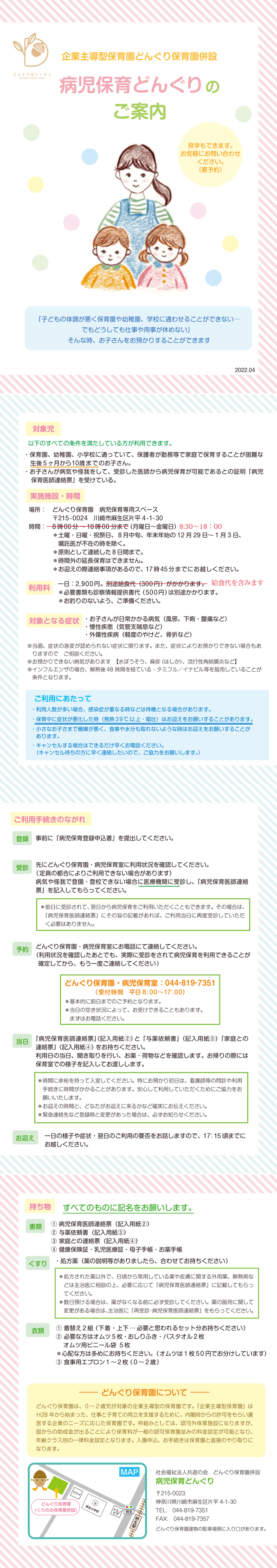 | 場所 | どんぐり保育園 病児保育専用スペース 〒215-0024 川崎市麻生区白鳥4-1-30 |